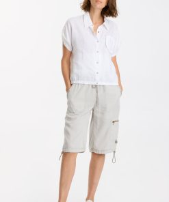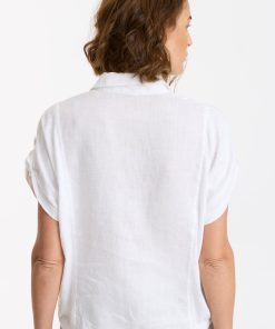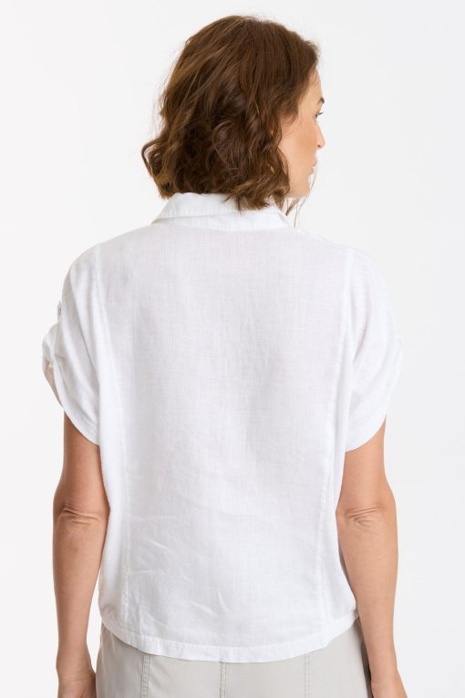 In light linen, Abner features a traditional collar, dolman sleeves, raw-edge patch pockets, a ruched hem with elastic sides, tabbed short sleeves, and contrasting back side panels in slub jersey.