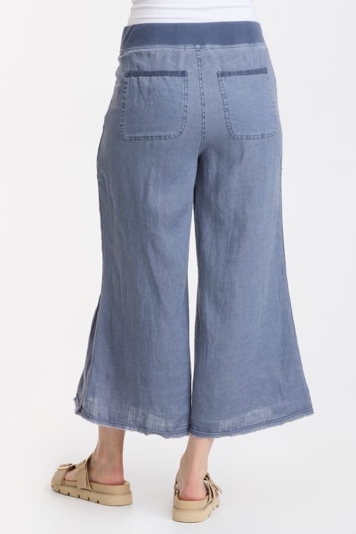 Pintuck pleats add textured detail to this pull-on elastic waist, Light Linen gaucho pant. A raw-edge hem, twill tape and antique brass hardware details, and a dart at the back pockets for a contoured fit finish off the look of this slightly cropped trouser.