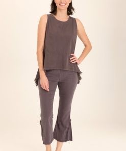 Another perfect stretch twill crop as a denim alternative option. Featuring a groovy raw edge wide leg created by open asymmetrical seaming up the calf, Hakarl has an elastic pull-on waistband with faux fly, two jean-style back pockets.