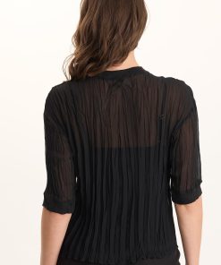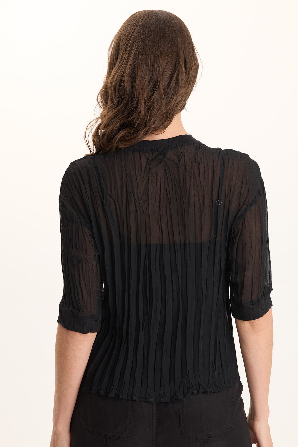 Semi-sheer and sophisticated, Cason is subtly sleek. Micro-pleated in Crinkled Georgette, Cason maintains versatility with a high neck and three-quarter sleeves.