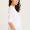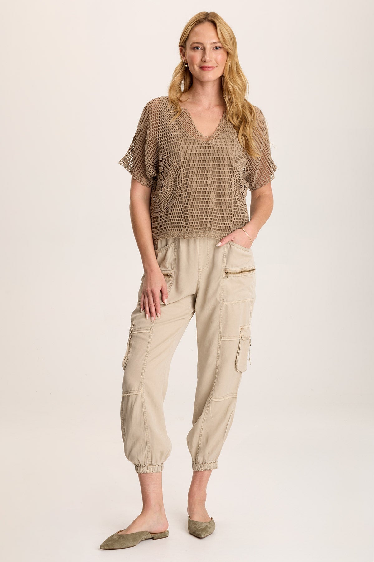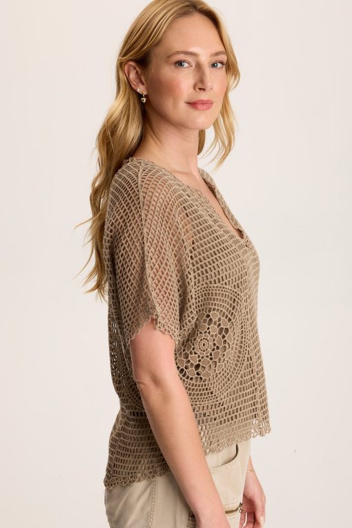 A circular crochet design adorns the side seams of this mesh crochet top. Centre Top has an attached jersey lining and a decorated v-neck.