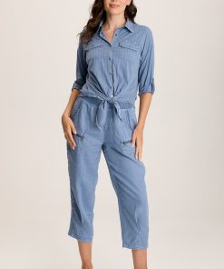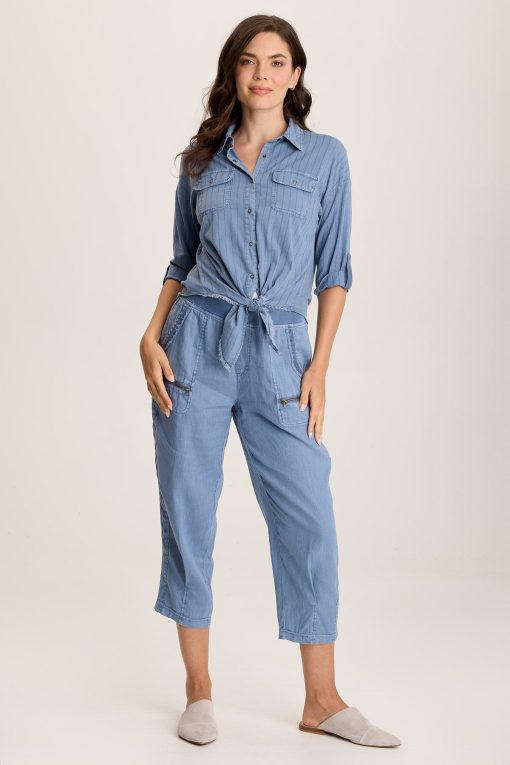 Tabbed three-quarter sleeves, flapped breast pockets, a raw-edge hem, snap-up closure, and a classic collar bring out the best in this ruggedly-inspired pinstriped linen blouse.