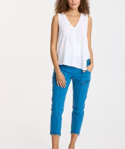 An ankle length slim fit pant with a pull on waist that features shirred panels, two inseam pockets, two patch zippered pockets, and a raw edge rounded hem.