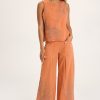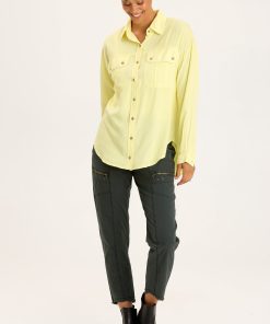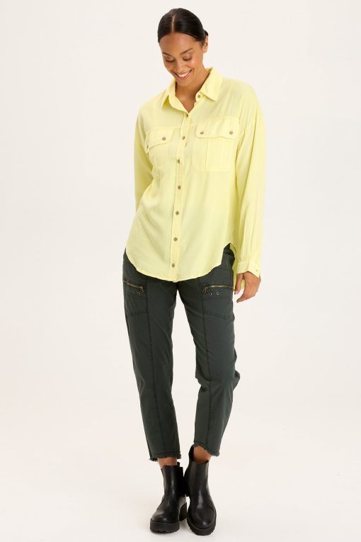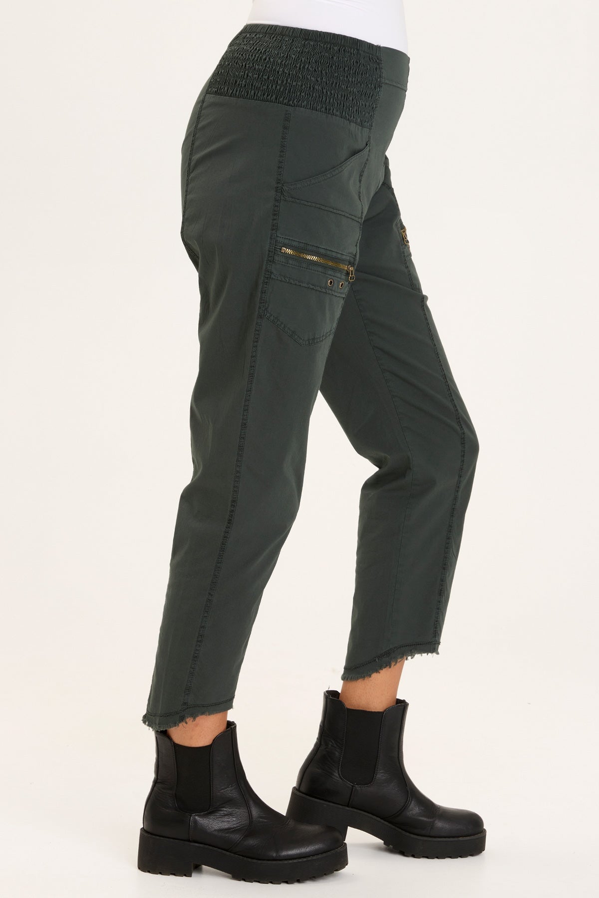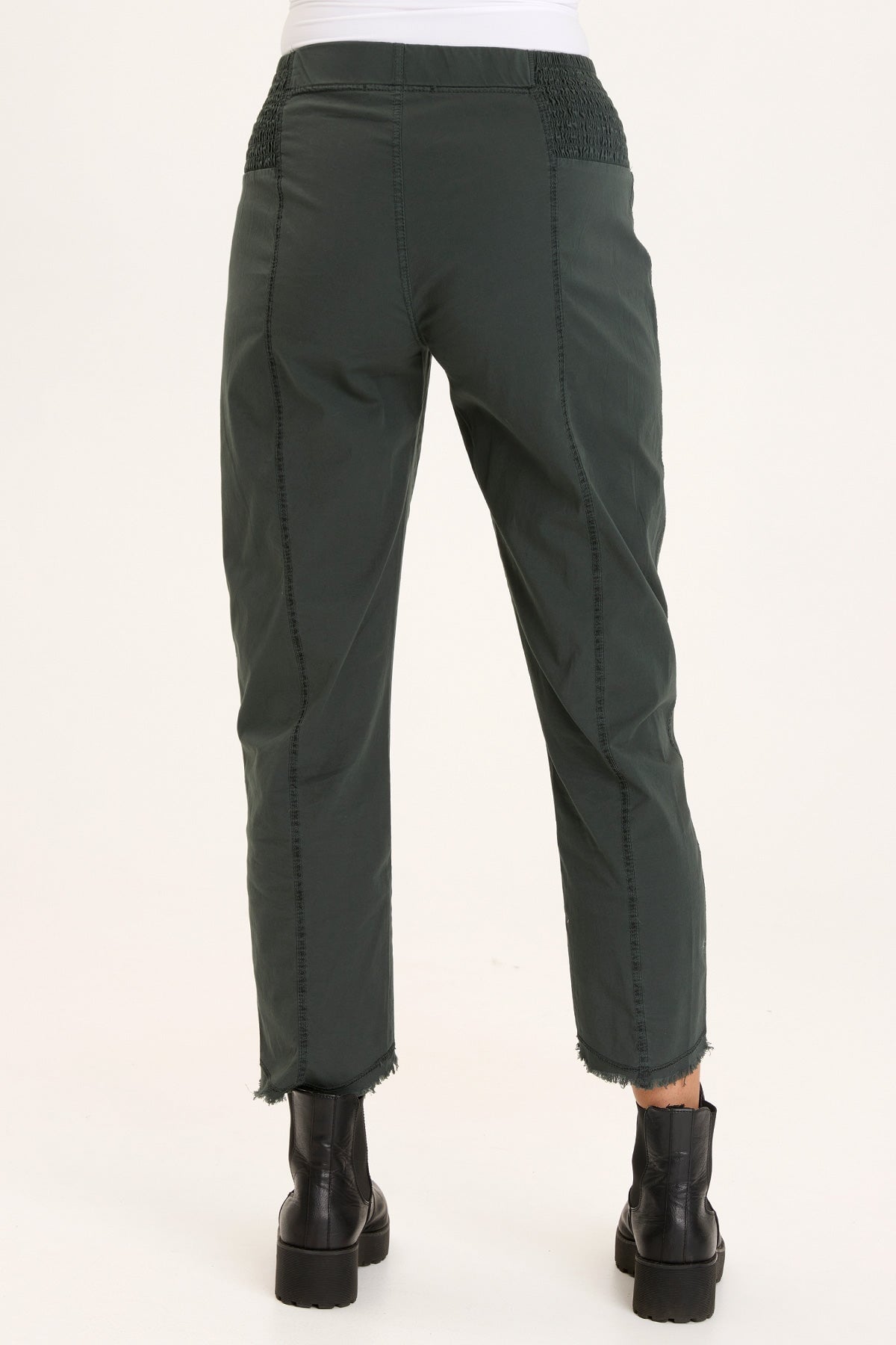 An ankle length slim fit pant with a pull on waist that features shirred panels, two inseam pockets, two patch zippered pockets, and a raw edge rounded hem.