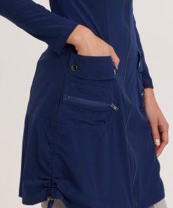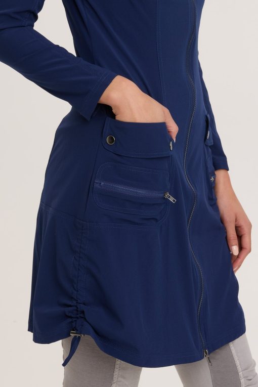 A long fitted, but stretch-able wear jacket dress is one of our staples. Here’s a new take on our jacket dress with 2 zip pockets atop 2 faux-flap cargo pockets and drawstring pull sides for extra flair. With a slim hood this active little darling is a multi-wear jacket.