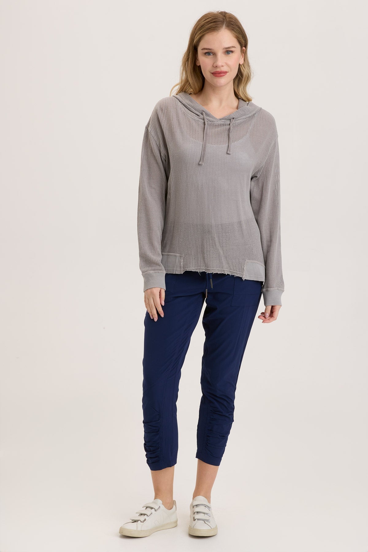 A Jetter spin off; this active legging features a drawstring waist, front pockets with zipper details, our classic ruched leg panels, back pockets and enough sass to keep you going all day!