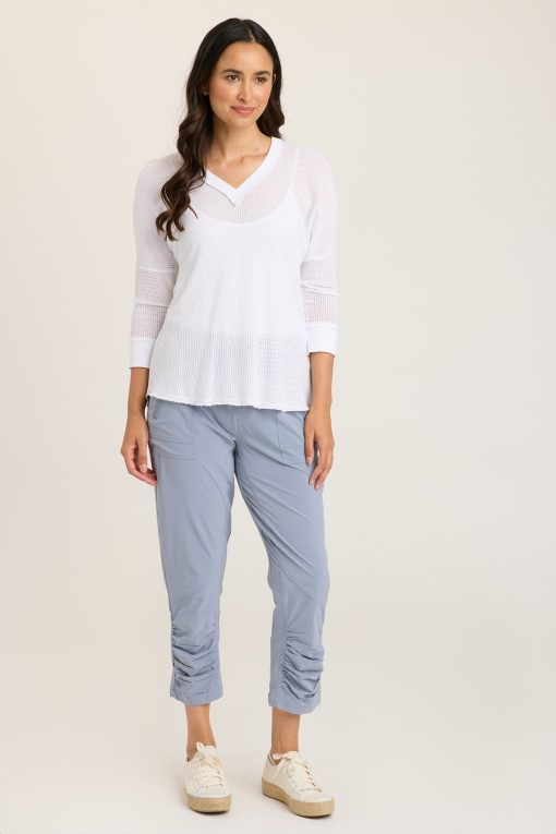 A Jetter spin off; this active legging features a drawstring waist, front pockets with zipper details, our classic ruched leg panels, back pockets and enough sass to keep you going all day!