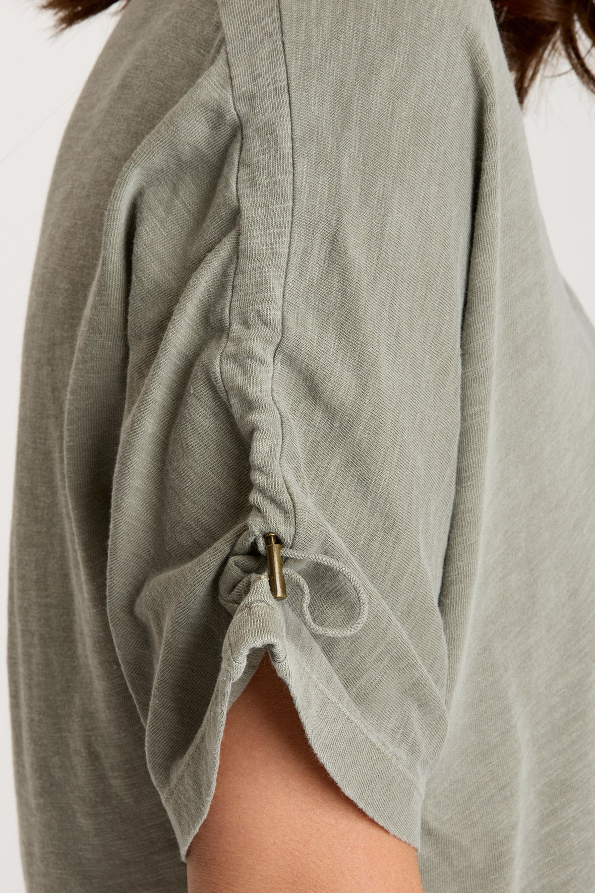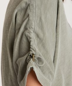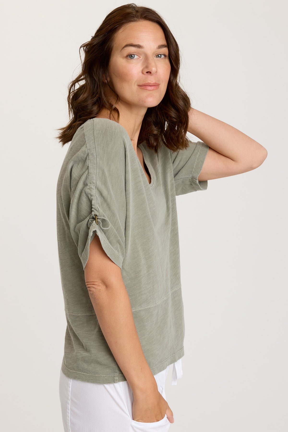 Ashla features a wide, dipped neckline and elongated sleeves with adjustable ruched channels. Unique seaming and soft, stretchy jersey material finish off this unexpectedly-detailed upgraded tee.