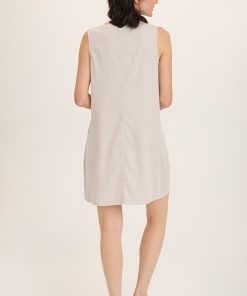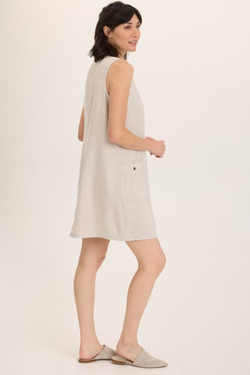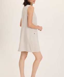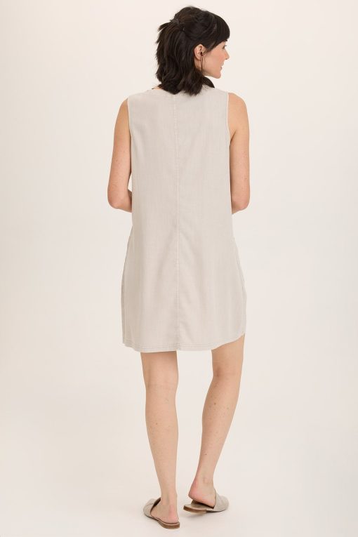 A sweet a-line shift mini dress with large pockets at the hips and a drawstring neckline.