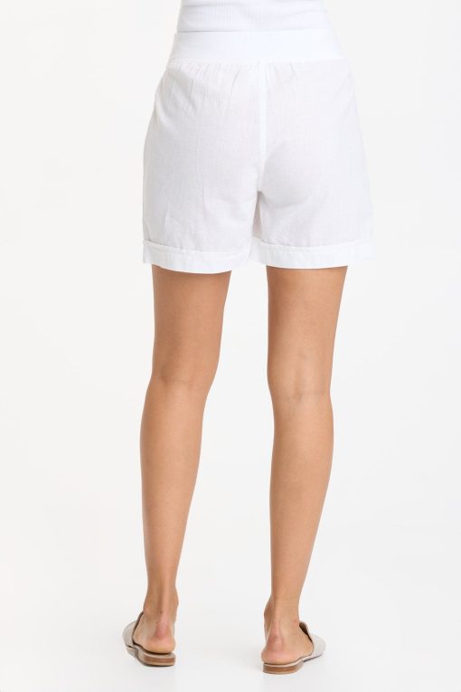 Brass ring snaps are featured on two mini cargo pockets and side seam tabs. With a high waist cut and an elastic waistband, this classic cotton linen short is a must for your seasonal update!