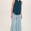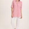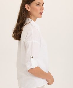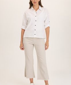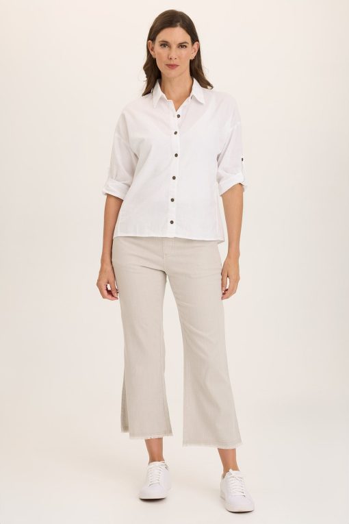 A simple warm weather button-up, the Carrie has 3/4 sleeves with tabbed details, coconut buttons and a slight high low hem.
