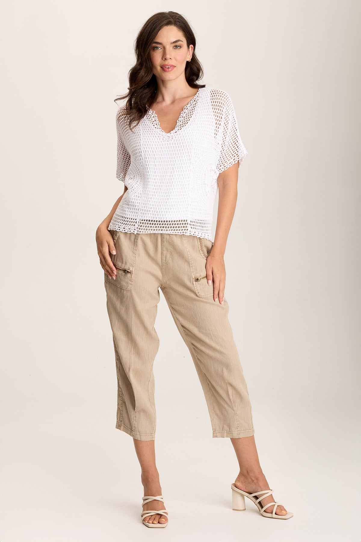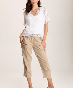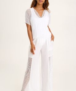 A circular crochet design adorns the side seams of this mesh crochet top. Centre Top has an attached jersey lining and a decorated v-neck.