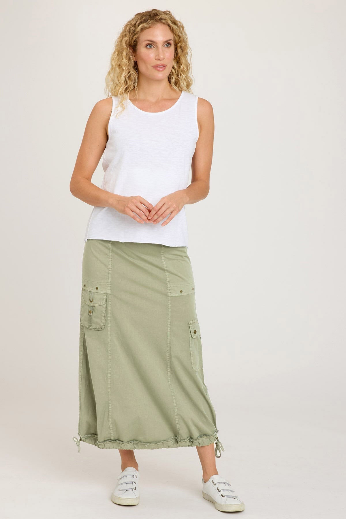 An adjustable, cinchable, gathered drawstring hem gives the Corintha midi that bubbly silhouette, accompanied by hardware-adorned pockets throughout. In soft and cozy Brio Poplin with a stretchy rib waistband, Corintha is the cargo skirt you’ve been waiting for.