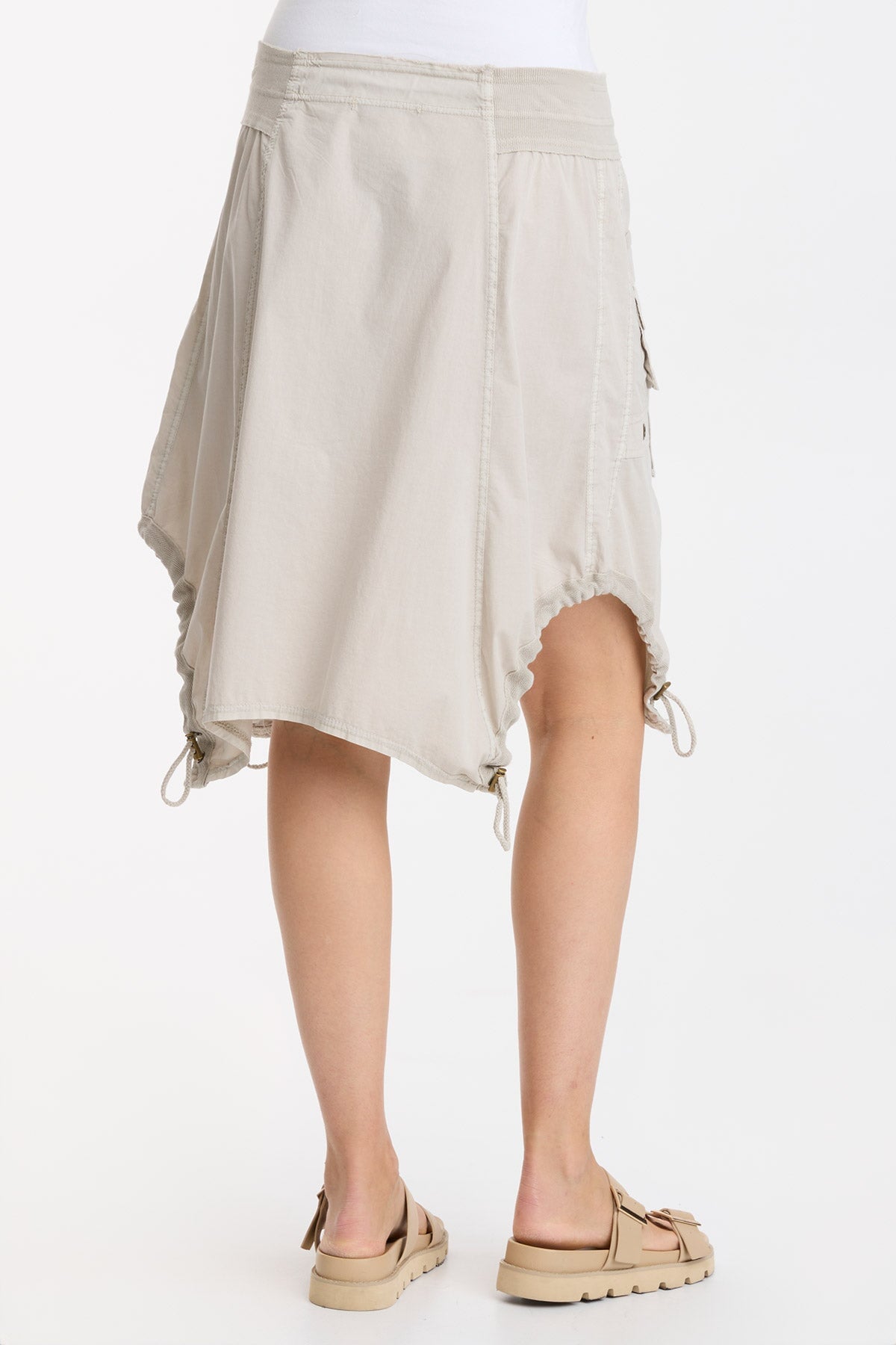 A cinchable chorded high side mini with antique brass stoppers, a raw-edge contrast ribbed waistband, mini cargo pockets with buckles and tabs, and antique brass hardware eyelet details.