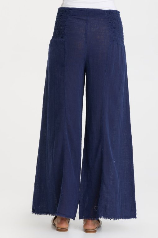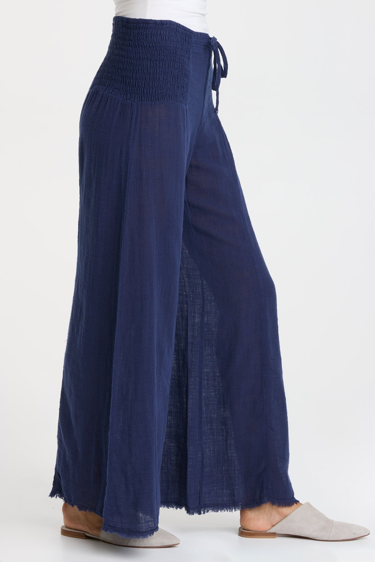 Now in Cocoon Gauze, beloved Kaj features a smocked elastic side waist with a functional drawstring, a wide-leg silhouette, and a raw-edge hem for a flattering, streamlining look.
