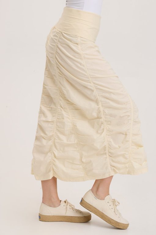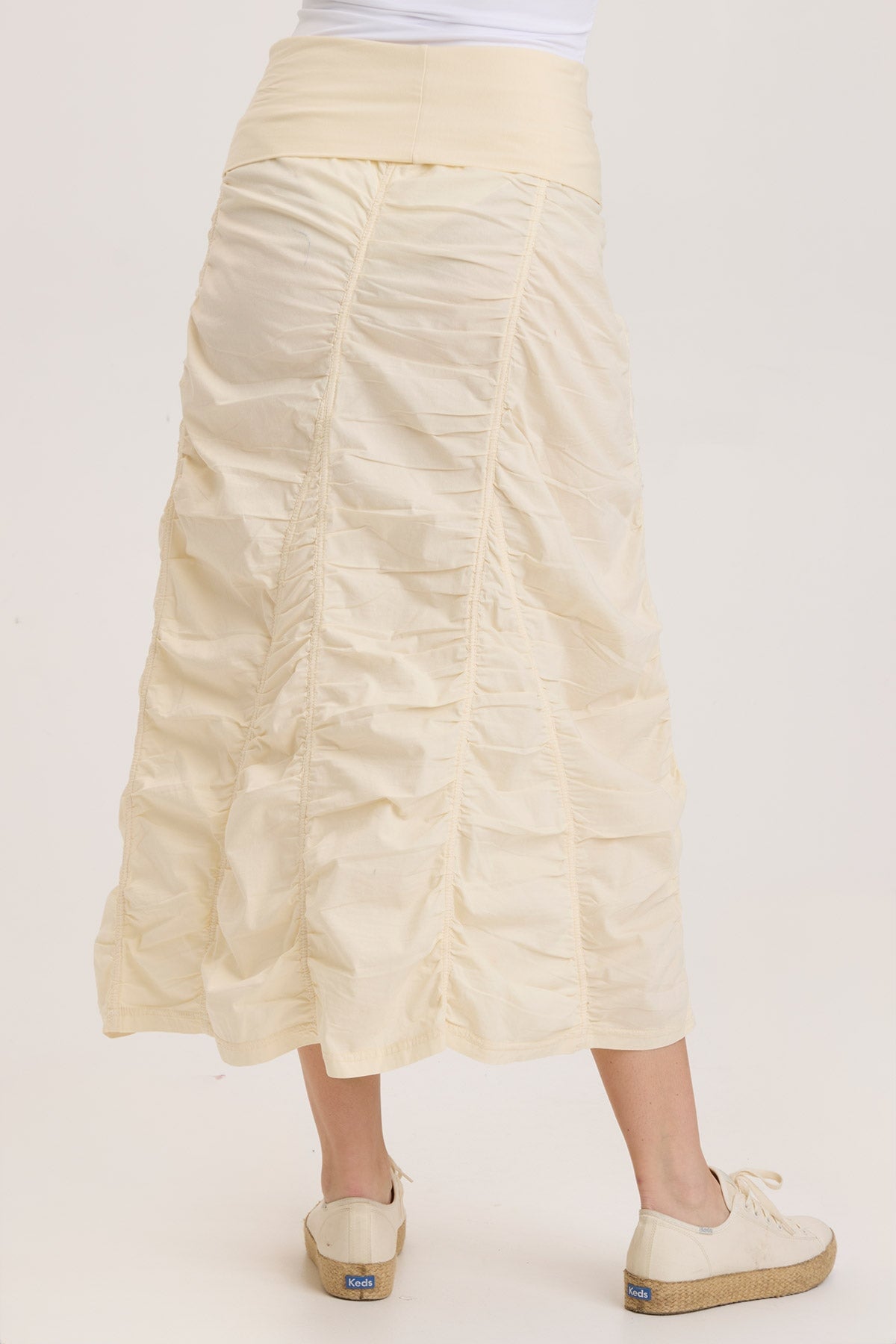 An old trusted style is back! Asymmetric seams run from the right and then to the left with shirring throughout each gored section. A foldover soft jersey waistband round out this classic style.