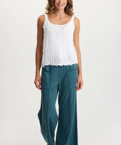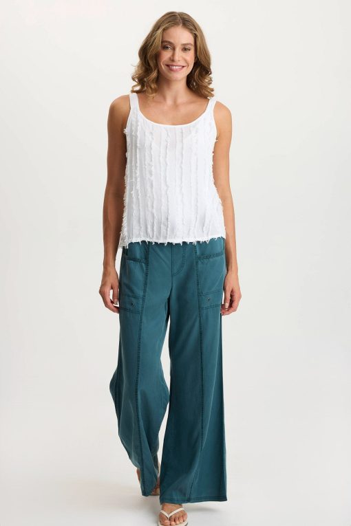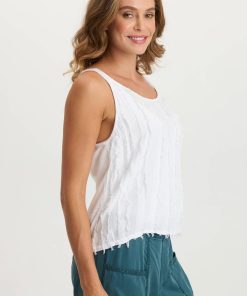 A fun new fabric graces the front of the Haddon Tank. A shredded stripe voile is center stage in this simple a-lined tank with twill tape straps and a contrast slub jersey back.