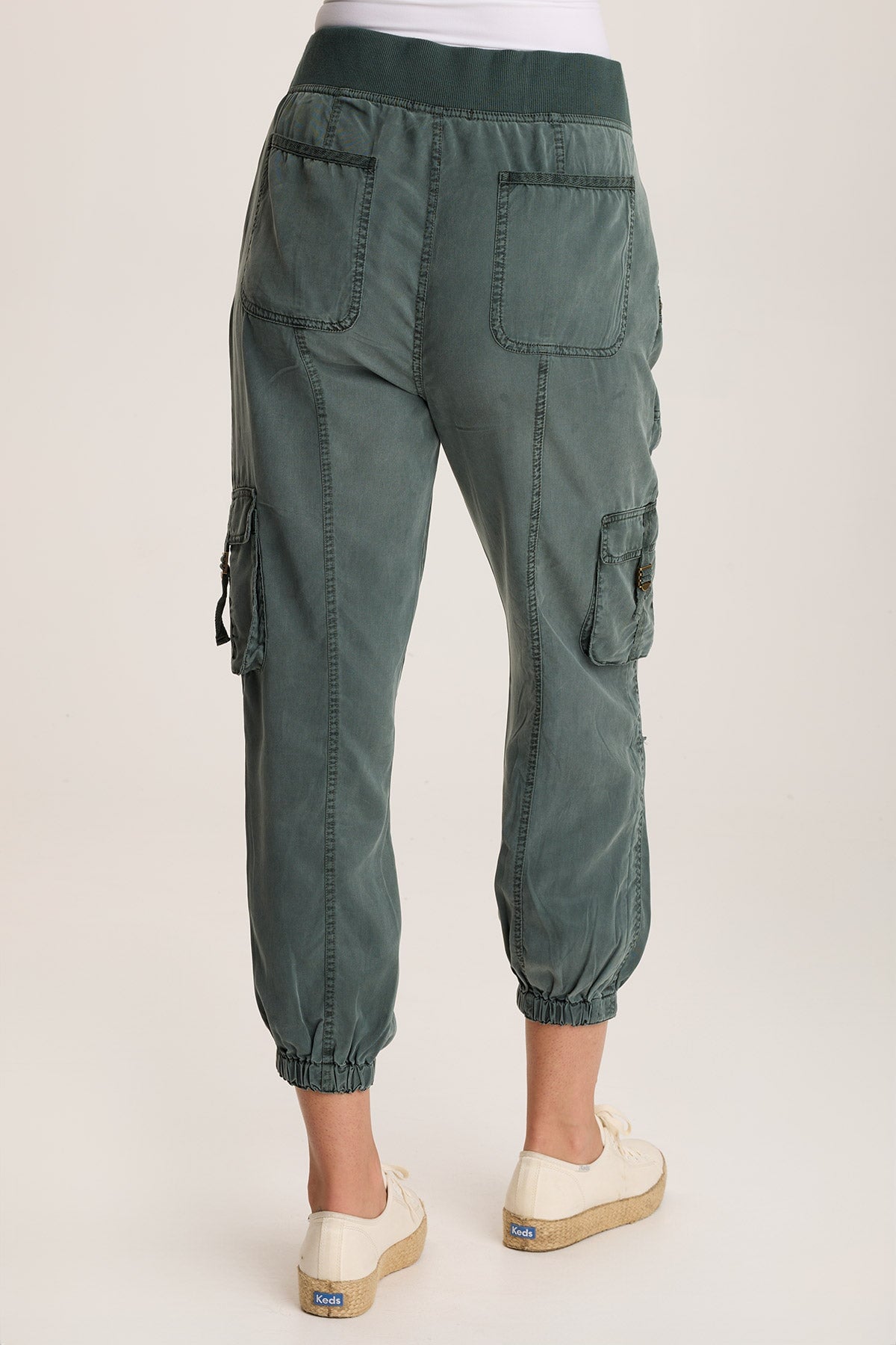 A soft twill crop with jogger-inspired banding at the leg opening and a pull-on waist. Hansa offers a classic cargo look, complete with plentiful pockets graced with antique brass hardware.