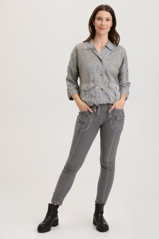 A light throw-on-able jacket is just what you need. Lucky day! Ilyse has a sequined looped flower design across the front panels of this cinchable hem, 3/4 sleeve jacket. Brass hardware abounds while a back contrast yoke compliments the drop shoulder look.