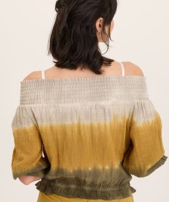 Billowing three-quarter sleeves with elastic bands pair up with layered elastic shirring at the neck so Jolia can be worn on or off the shoulder. A banded ruffle hem finishes this semi-cropped Cocoon Gauze style.