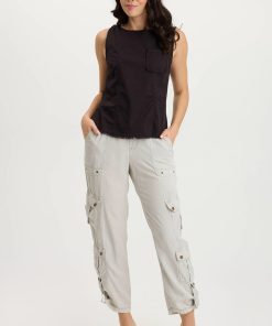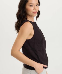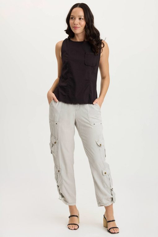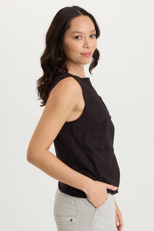 A novel idea, a perforated effect has been applied to our poplin to create the look of this simple tank. Landis has a contrasting slub jersey on the back and one lone breast pocket on a seamed front panel.