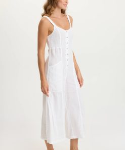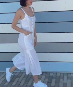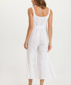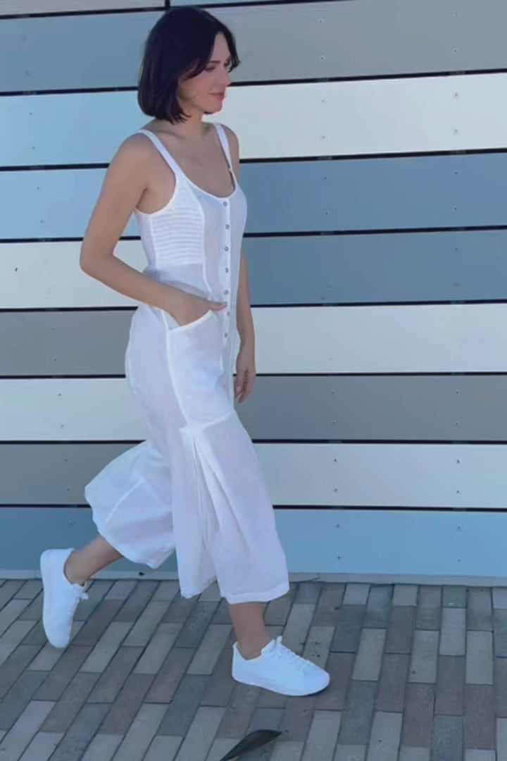 Simply the cutest and sleekest jumpsuit around! Leoda has ruching at the side bust, an elastic cinched back waist, snap up front closure, in-seam pockets and double box pleats dancing along the side seam of the leg.