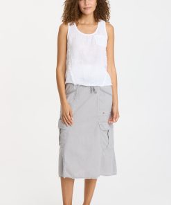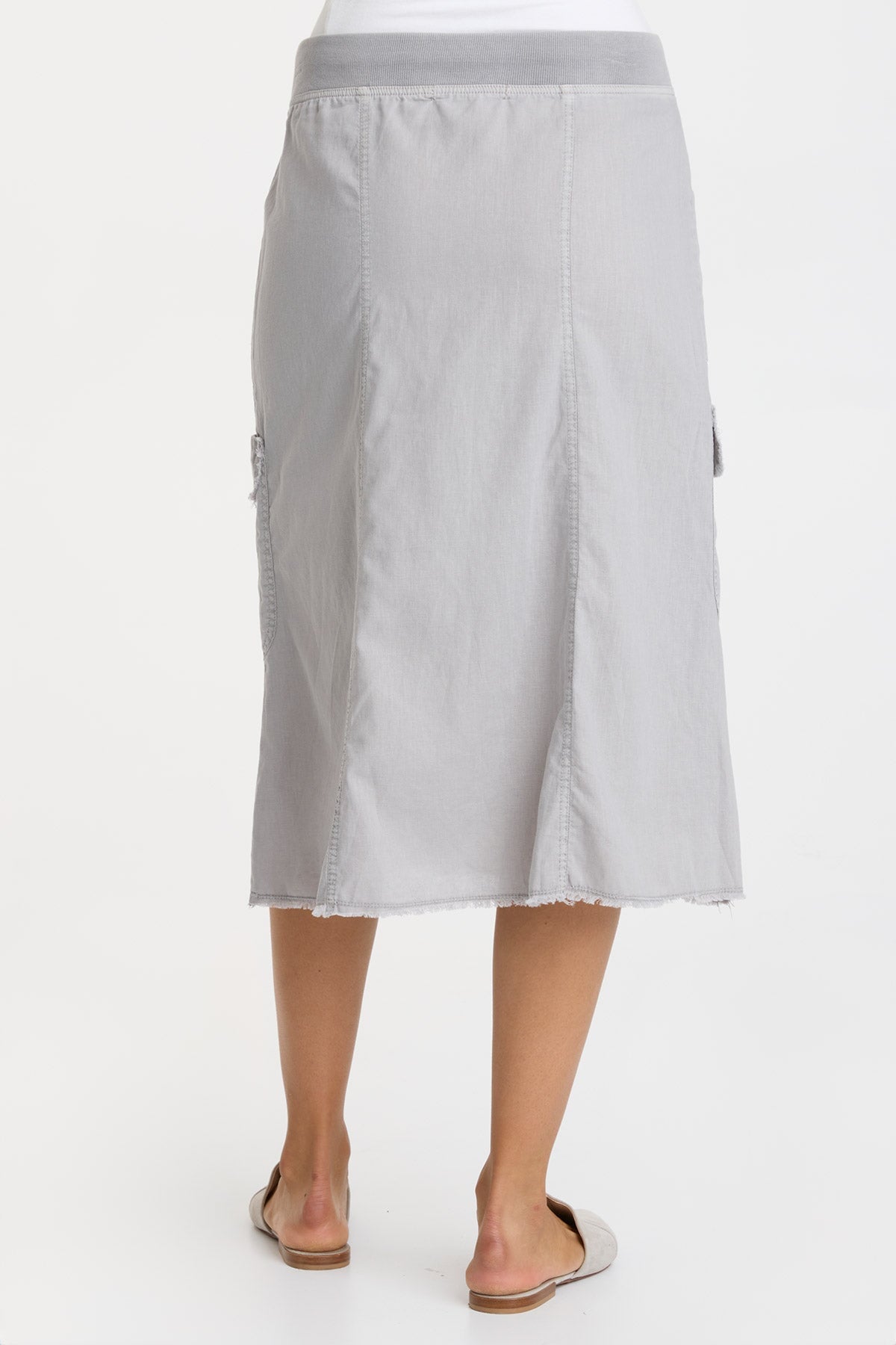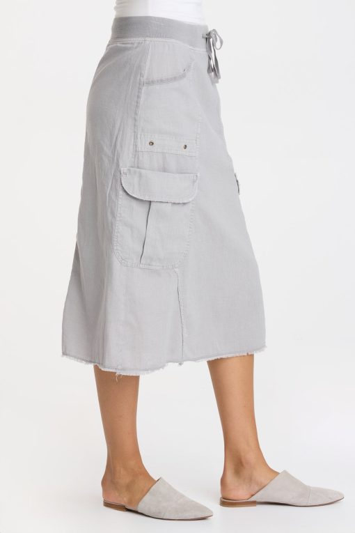 This time made in Cotton Linen, Bellamy brings the drama with exaggerated cargo pockets, adorned twill tape front pockets and antique brass eyelets. A rib-contrasted elastic drawstring waist compliments this slightly A-lined midi skirt.