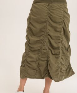 An old trusted style done is our soft Cotton Linen. Asymmetric seams run from the right and then to the left with shirring throughout each gored section. A foldover jersey waistband round out this classic style.