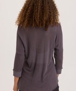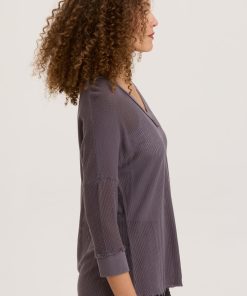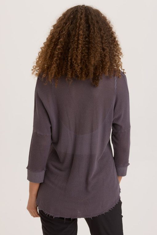Lounge in style. Made in our favorite breatheable mesh, the Fira Pullover is a long sleeve V-neck piece for easy weekend wear. Features panels at hem with rib cuffs and neckline.