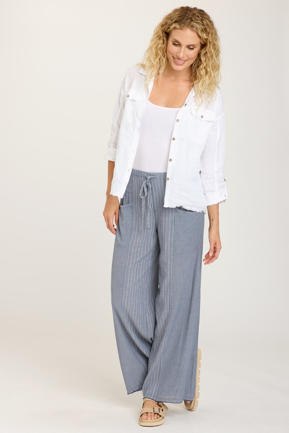 A generous, wide silhouette keeps Quita cozy and casual, while an adjustable waistband, roomy front pockets, and striped gauze panels amp up the detail.