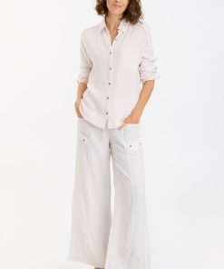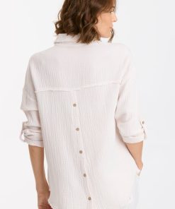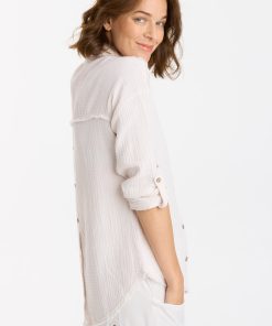 In Double Gauze, this blouse features coconut buttons, raw edges, dropped shoulder seams, along with a front and back yoke, a functional back placket, and tabbed three-quarter sleeves.