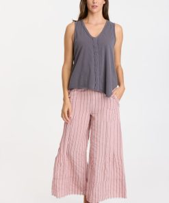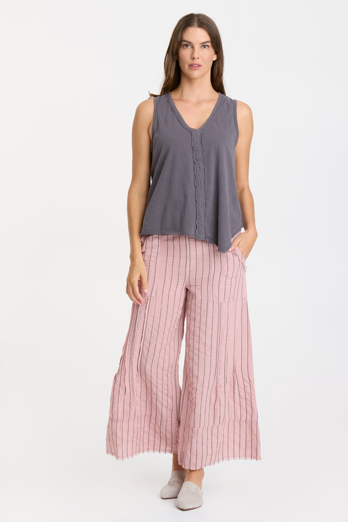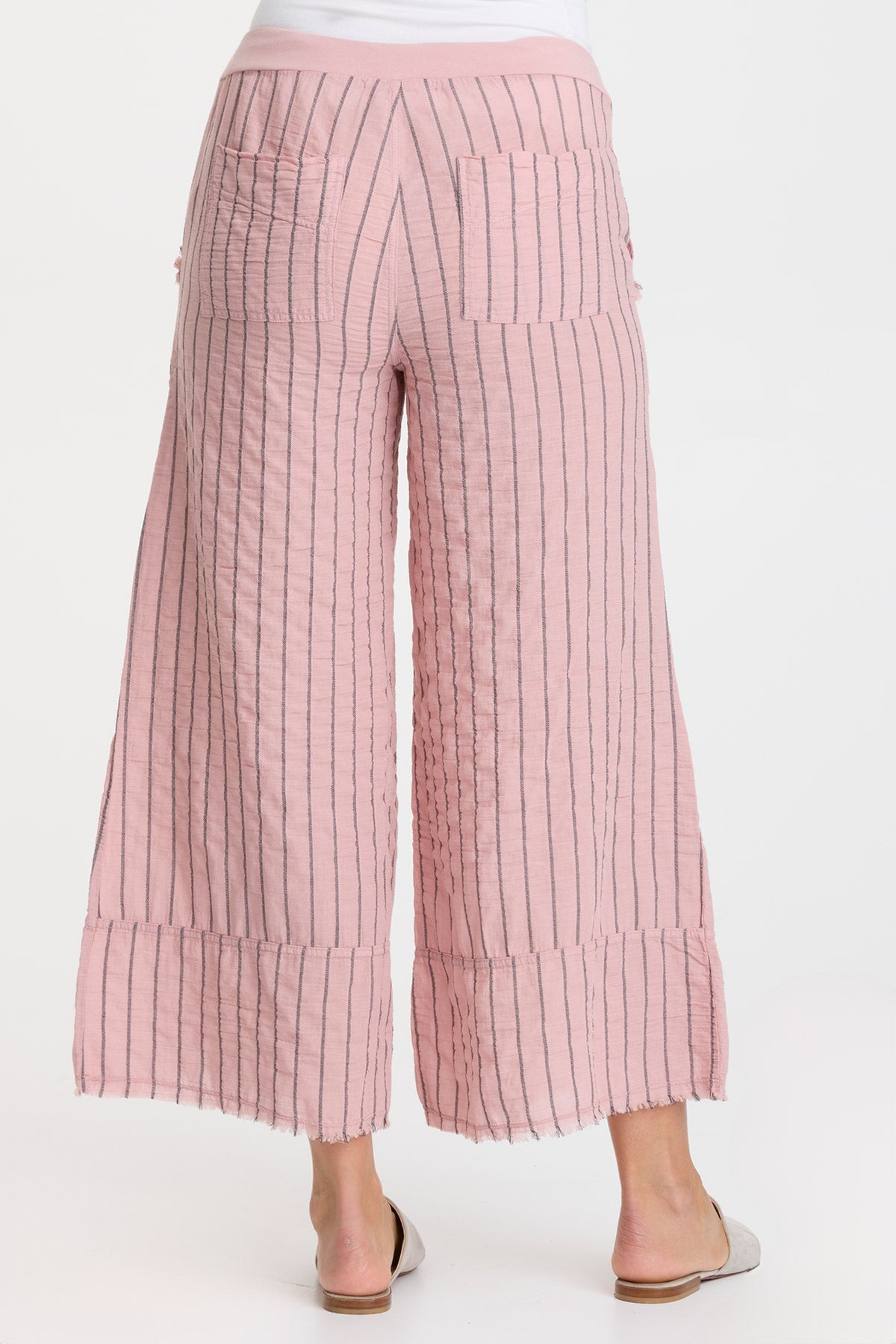 This wide-leg striped gauze crop features pin tuck details on leg front, front and back pockets, raw edge details on hem and pockets, and a drawstring waistband.