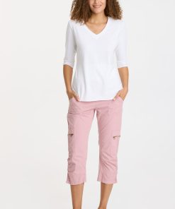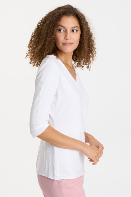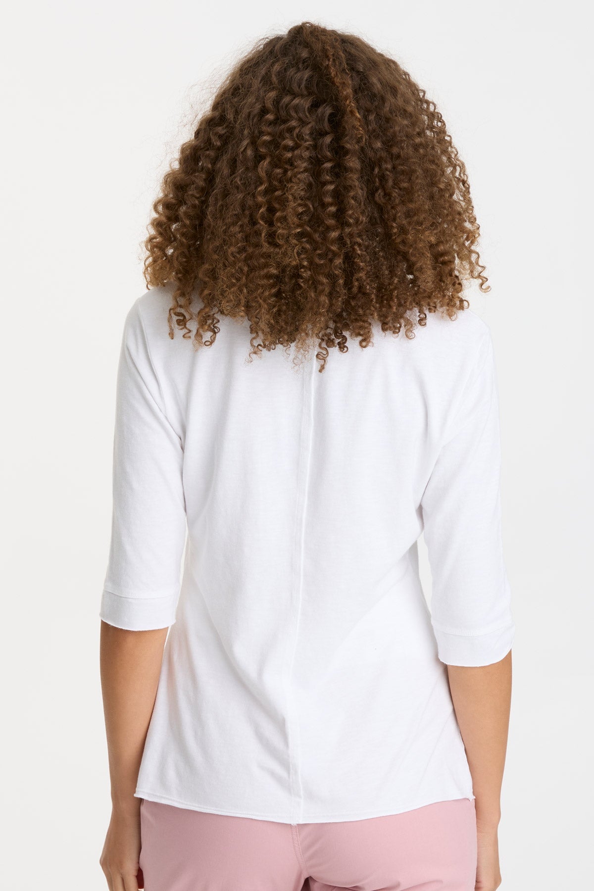 A three-quarter sleeve v-neck top made in soft jersey, Tina features raw edge details on the neck, sleeve opening, hemline, and center back seams.