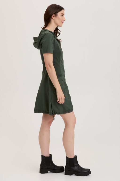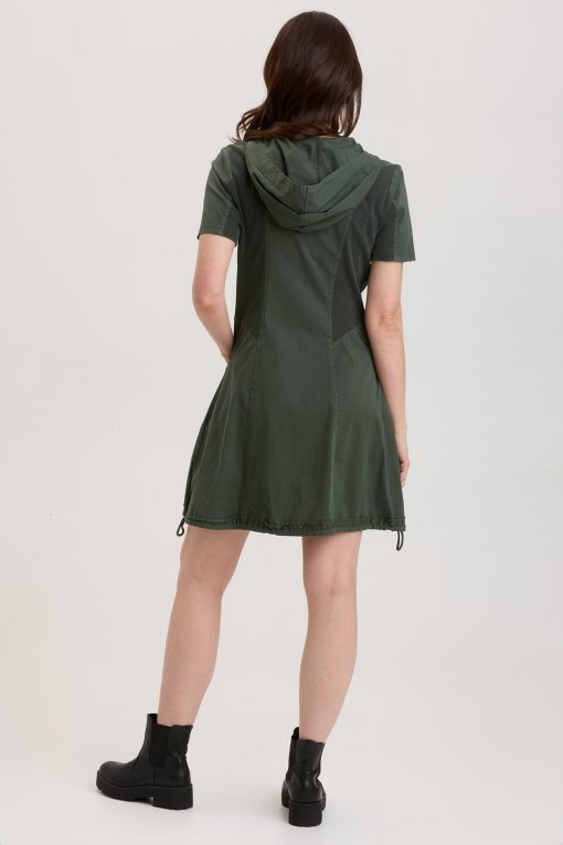 The famous jacket dress is on full display here. With exaggerated cargo pockets on top of front pockets, a cinchable bubble hem and brass hardware all around, this hooded number will have you collecting it in every color.