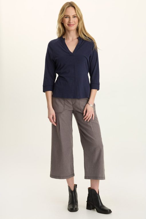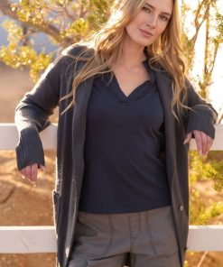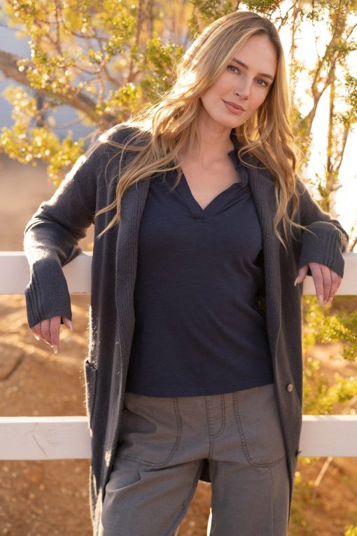 Soft slub jersey is once again a winner in this v-neck style featuring mid-length short sleeves. Flattering and functional, she’s a staple style waiting to happen!