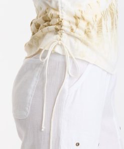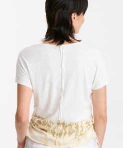 Cinchable side cords grace this v-neck slub jersey top; also featuring a front yoke, dolman sleeves, and raw-edge details throughout.