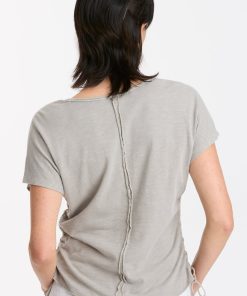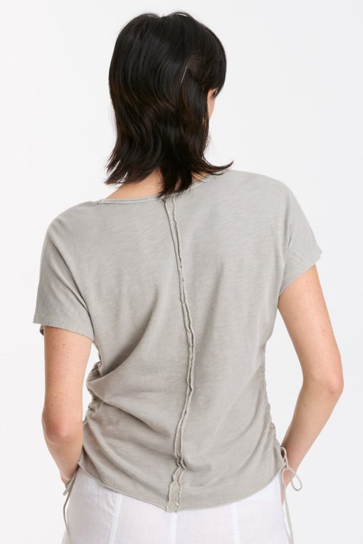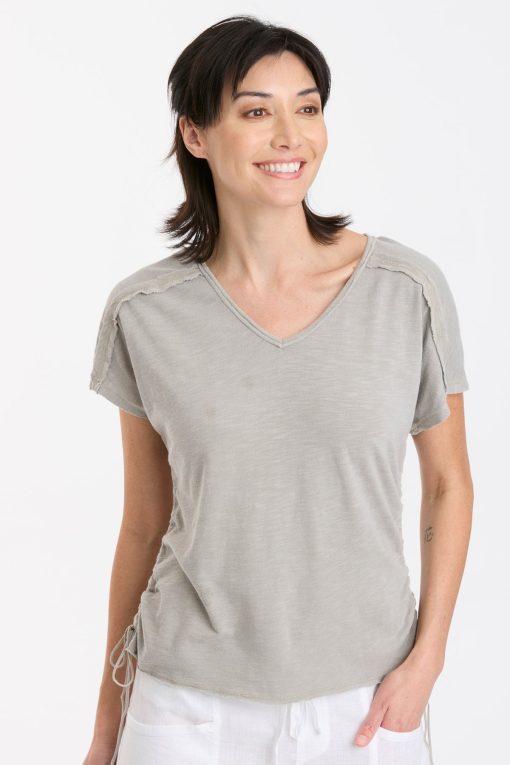 Cinchable side cords grace this v-neck slub jersey top; also featuring a front yoke, dolman sleeves, and raw-edge details throughout.