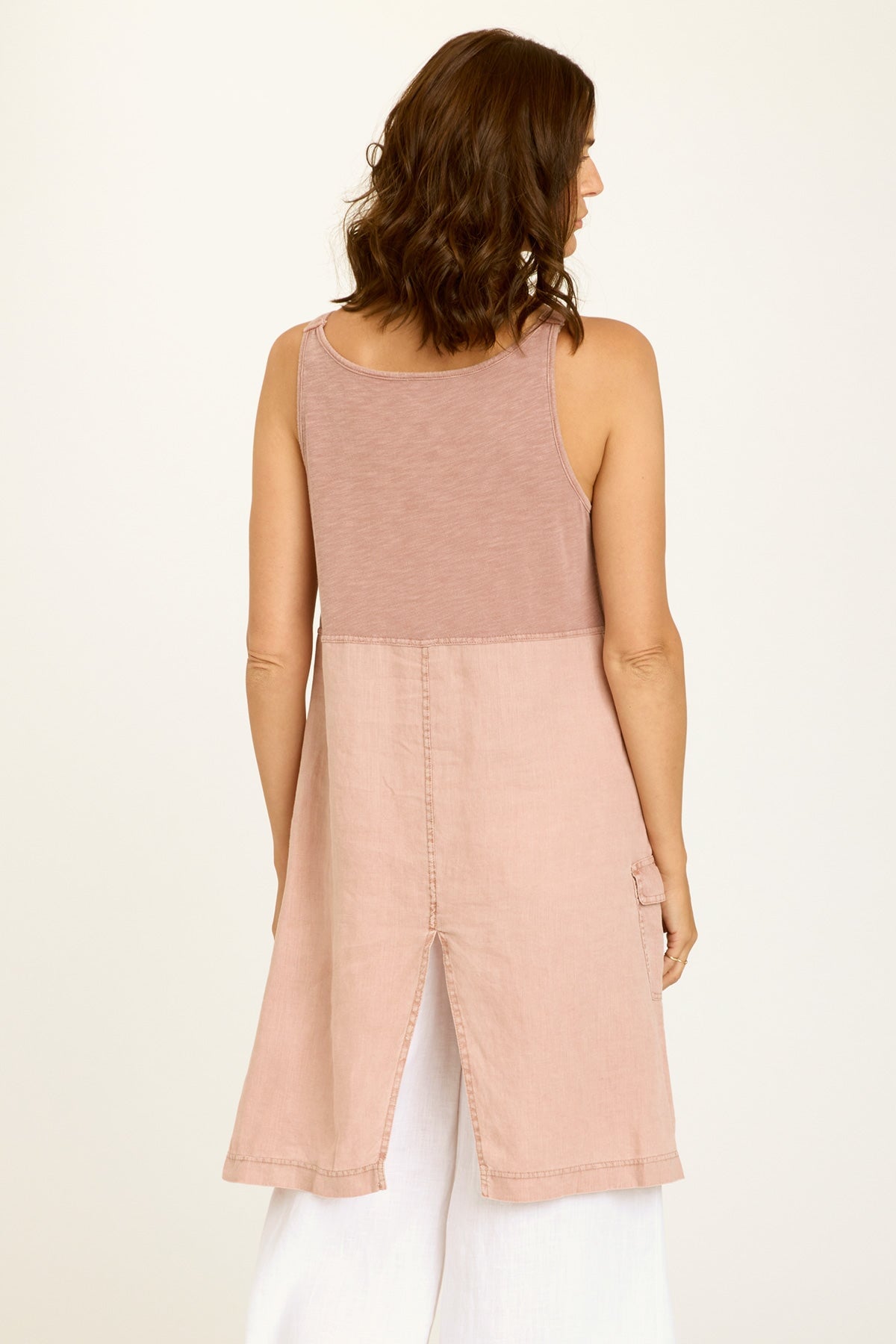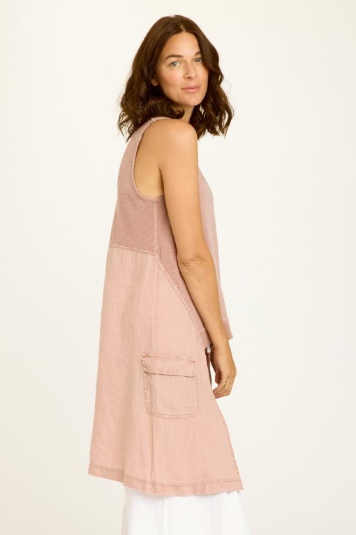 Unique as can be. In contrasting jersey and linen, Finton’s elongated side panels add some unexpected coverage and feature pockets for additional function. Adjustable antique brass hardware-buckled straps and rib at the front hem take things up a notch in this tunic-esque, novelty style.