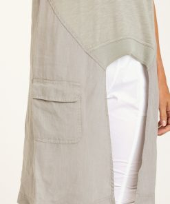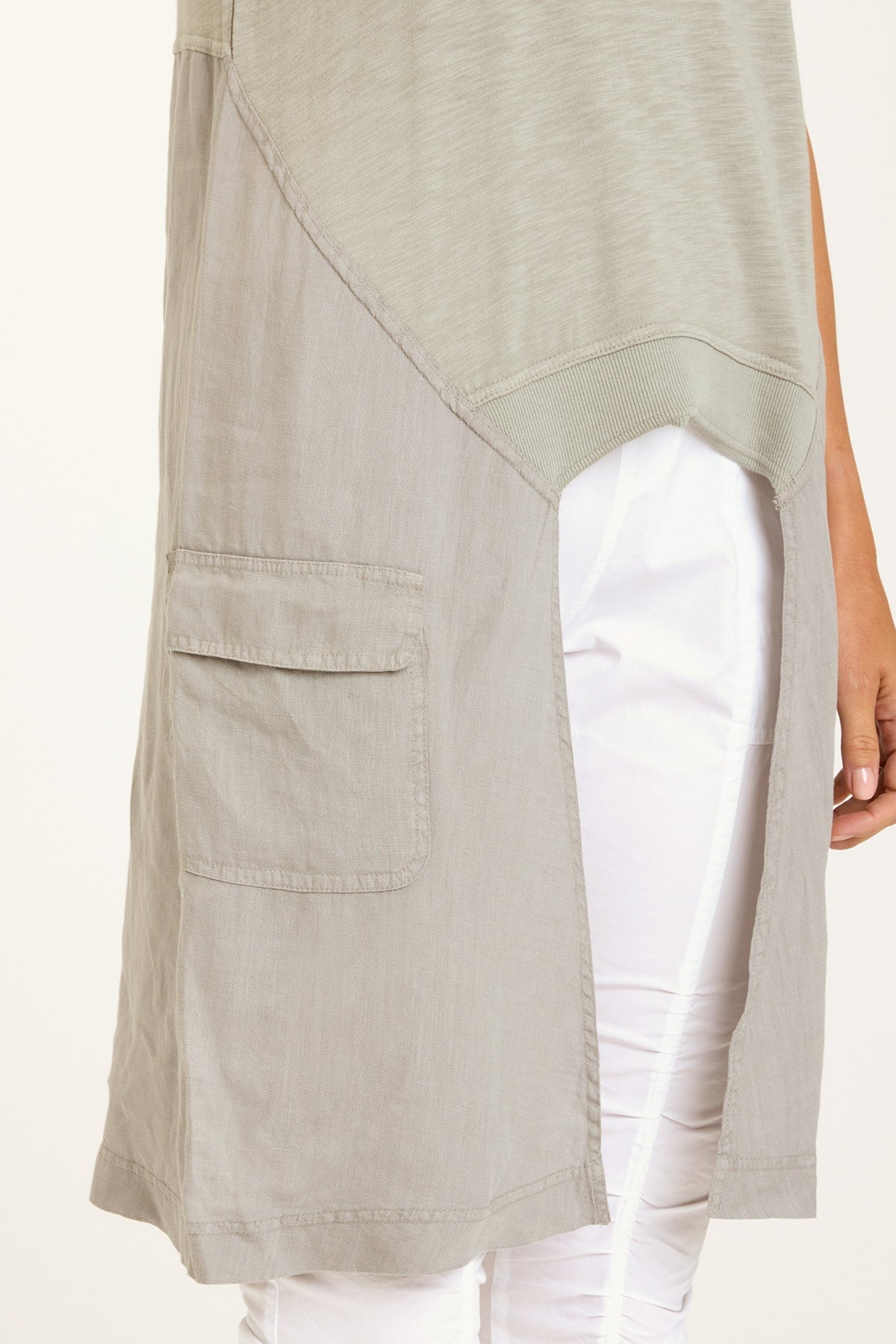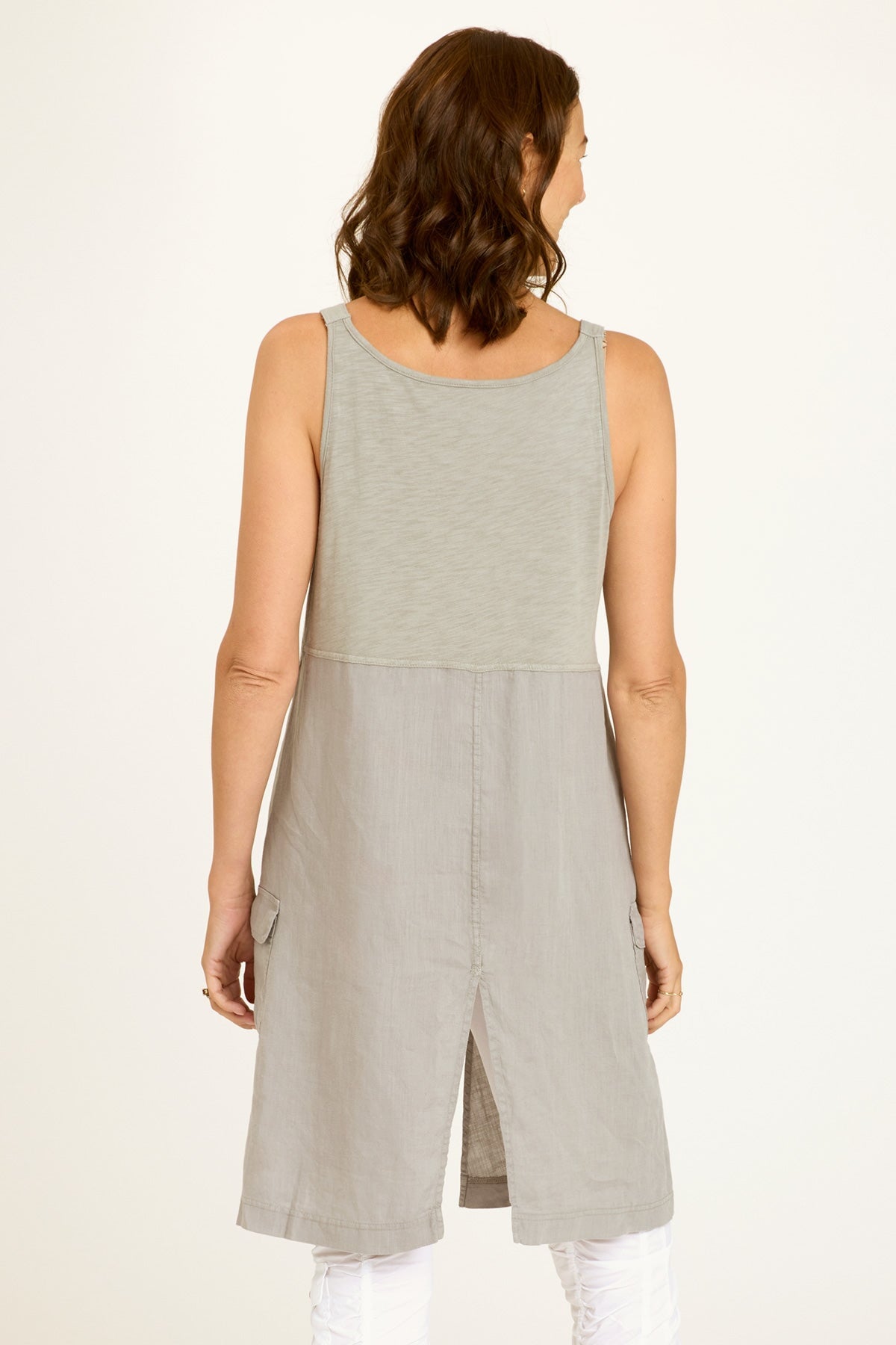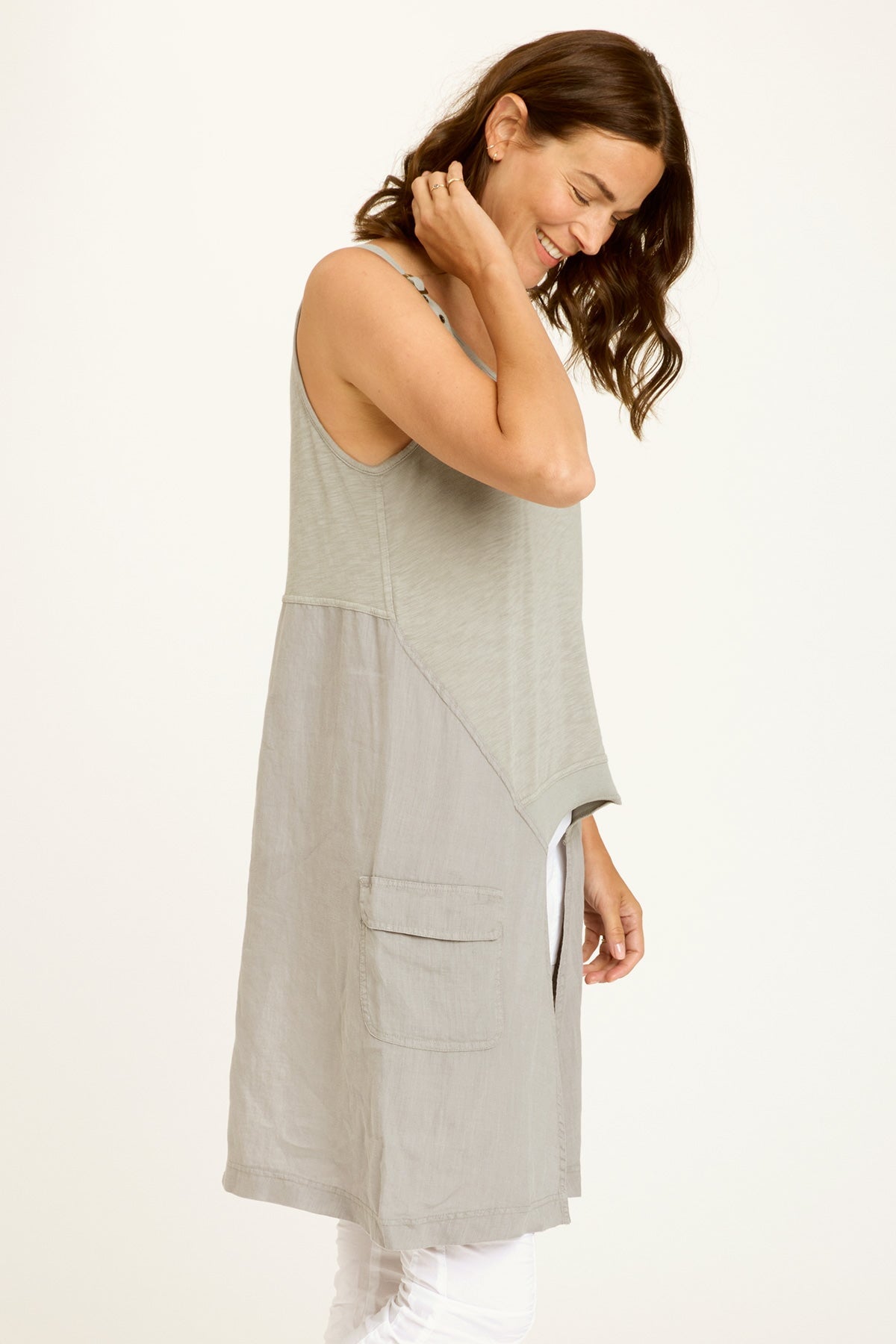 Unique as can be. In contrasting jersey and linen, Finton’s elongated side panels add some unexpected coverage and feature pockets for additional function. Adjustable antique brass hardware-buckled straps and rib at the front hem take things up a notch in this tunic-esque, novelty style.