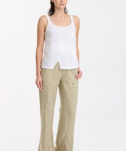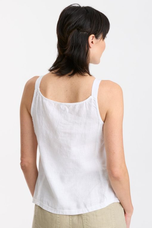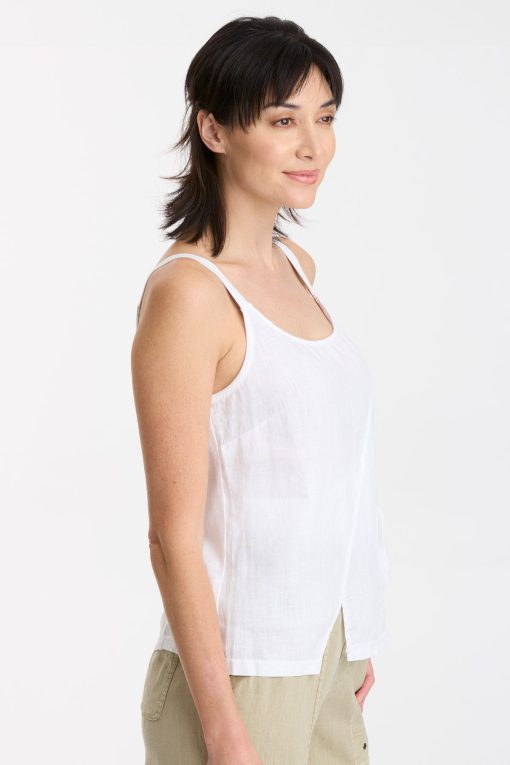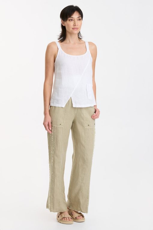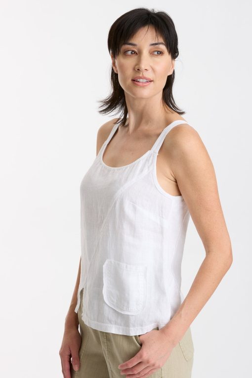 A twill tape-strapped tank with asymmetrical front seams, raw-edge details on the patch pockets, and contrasting back side panels in slub jersey.