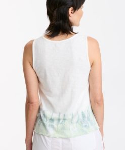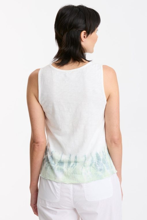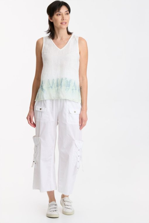 A lightweight linen bra-friendly v-neck tank with two functional ring snaps at the side seams, a slub jersey contrasting back panel, and a raw-edge hem.
