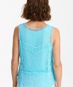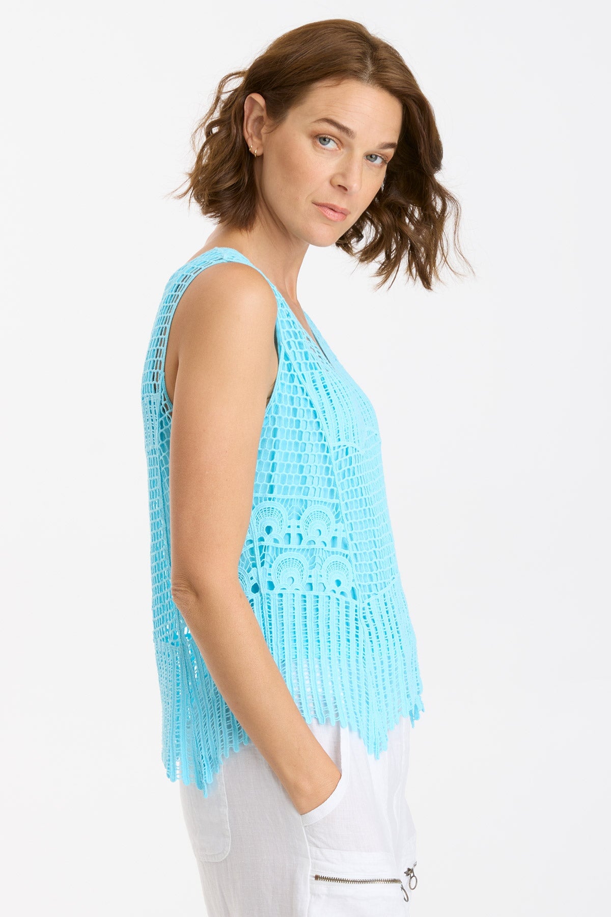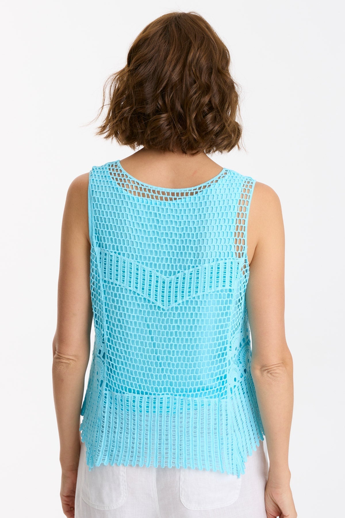 A cotton crochet tank with scalloping and mesh paneling, attached jersey lining, and a v-neck with a sharkbite-esque hem.