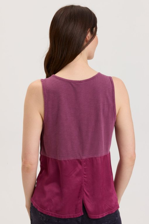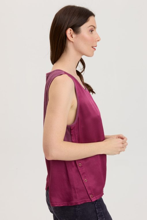 Welcome the Markos Tank with its functional side placket adorned with brass ring snaps, a split back lower panel and a bit of stretch across the back with contrast jersey.