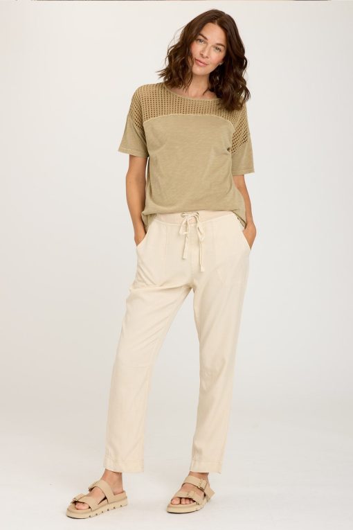 Elongated t-shirt sleeves and crochet mesh paneling along the collar and shoulders amp up this cutesy, boxy stretch jersey top.