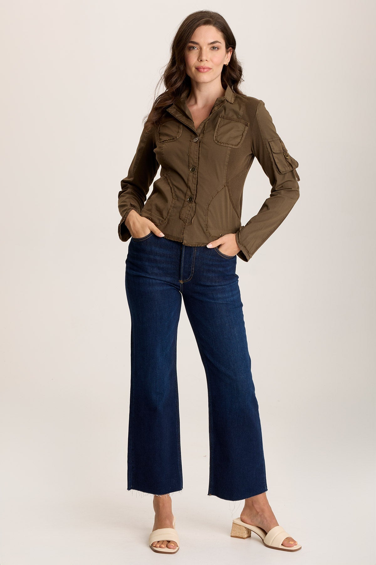 A sharp lapel, three-button design with breast pockets, antique brass detailed pockets, and raw-edge hem bring on the unexpected. A lightly curved silhouette and pointed wrist cuffs top it all off on this subtly cropped, blazer-inspired jacket.