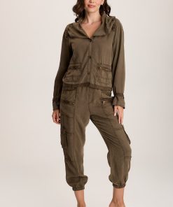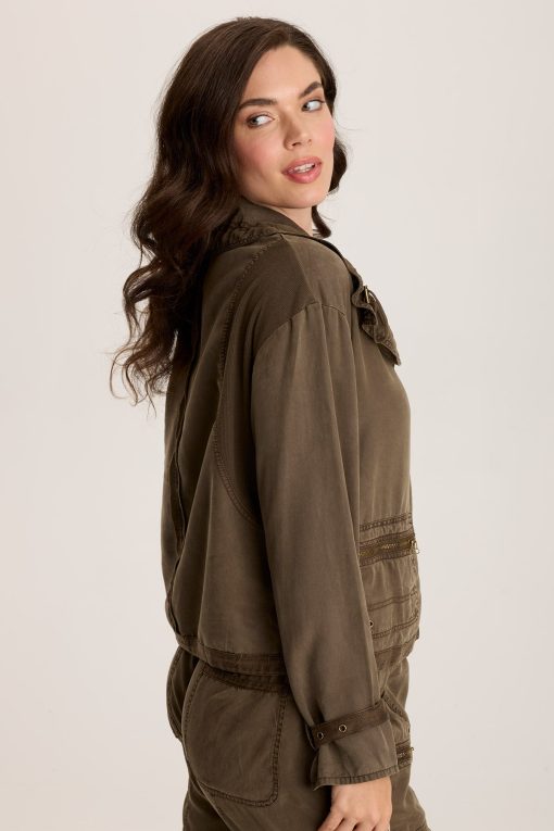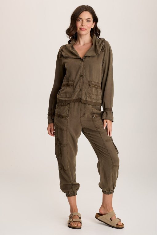 A voluminous collar with corded adjustable ruched channels, a three-brass button closure, and zippered pockets make this relaxed-fit twill style a visual feast!