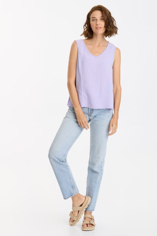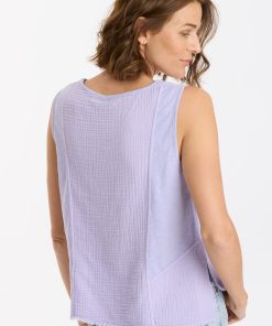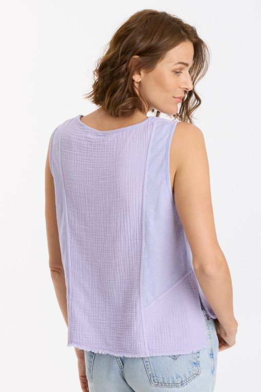 In plush Double Gauze, this v-neck tank features bra-friendly straps, contrasting jersey panels, a raw-edge hem, and side-seam splits for some extra pizzazz.