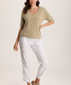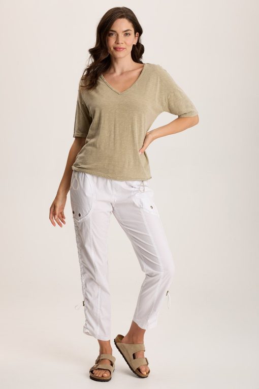 Banded elbow-length sleeves, a v-neck cut and adjustable corded hem bring a touch of the unexpected to this jersey top.