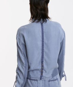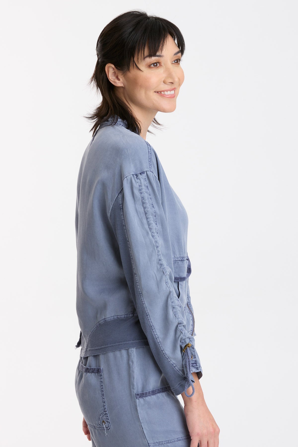 Cinchable corded sleeves with antique brass stoppers bring the adjustable novelty to this Soft Twill varsity jacket. Raw edges at the collar and hem, pleated cargo pockets, a ring-pull zipper, functional back placket, twill tape detailing, and contrasting ribbed collar, side hem, and under-sleeve finish off this unique piece of lightweight outerwear.