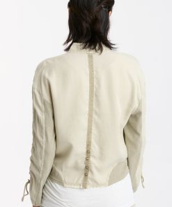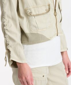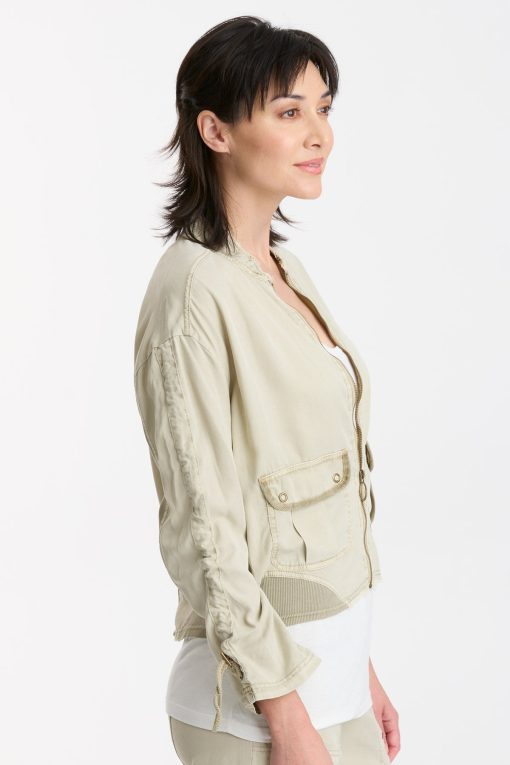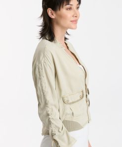 Cinchable corded sleeves with antique brass stoppers bring the adjustable novelty to this Soft Twill varsity jacket. Raw edges at the collar and hem, pleated cargo pockets, a ring-pull zipper, functional back placket, twill tape detailing, and contrasting ribbed collar, side hem, and under-sleeve finish off this unique piece of lightweight outerwear.